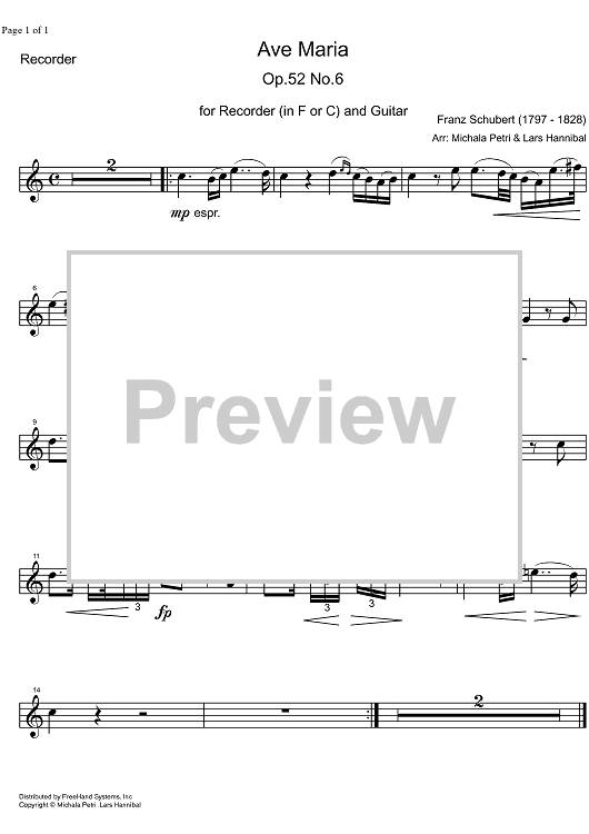 Digital Sheet Music for Ave Maria D839 - Recorder by Franz Schubert, Lars Hannibal, Michala Petri scored for Recorder/Guitar; id:327769