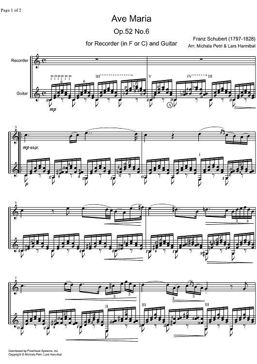 Digital Sheet Music for Ave Maria D839 - Score by , Franz Schubert, Lars Hannibal, Michala Petri scored for Recorder/Guitar; id:327768