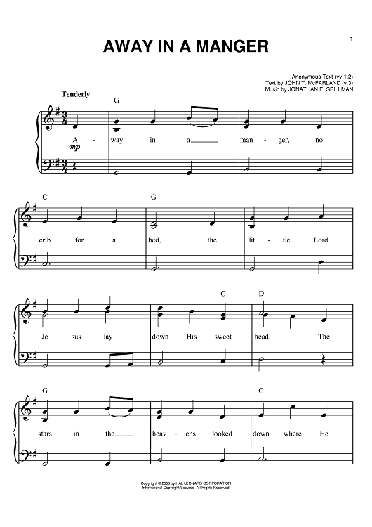 Digital Sheet Music for Away In A Manger by Unknown Writer, Jonathan E. Spilman, John T. McFarland scored for Easy Piano; id:384273
