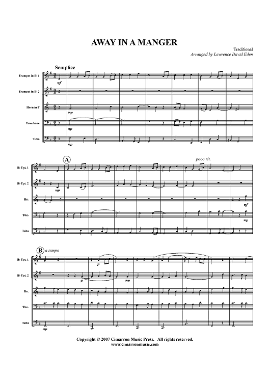 Digital Sheet Music for Away in a Manger - Score by Traditional, Lawrence David Eden scored for Brass Quintet; id:413702