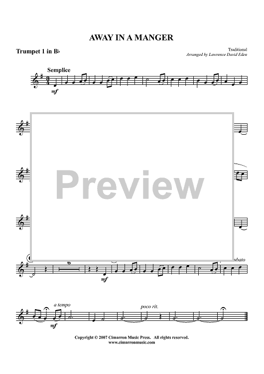 Digital Sheet Music for Away in a Manger - Trumpet 1 in Bb by Traditional, Lawrence David Eden scored for Brass Quintet; id:413703