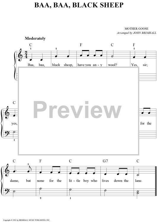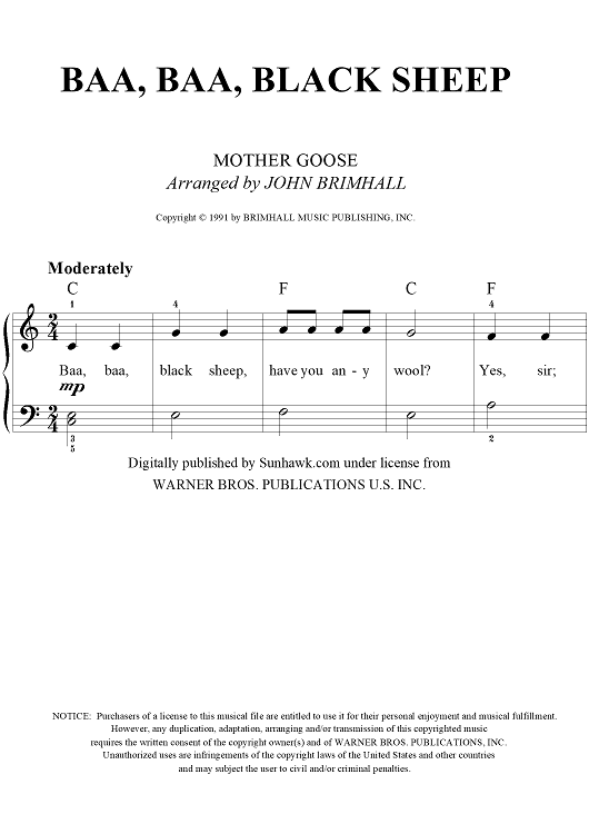 Digital Sheet Music for Baa, Baa Black Sheep by John Brimhall, Mother Goose scored for Easy Piano/Vocal; id:252298