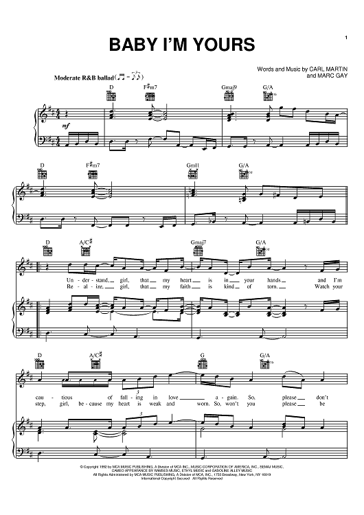 Digital Sheet Music for Baby I'm Yours by Marc Gay, Carl Martin, Shai scored for Piano/Vocal/Chords; id:384068