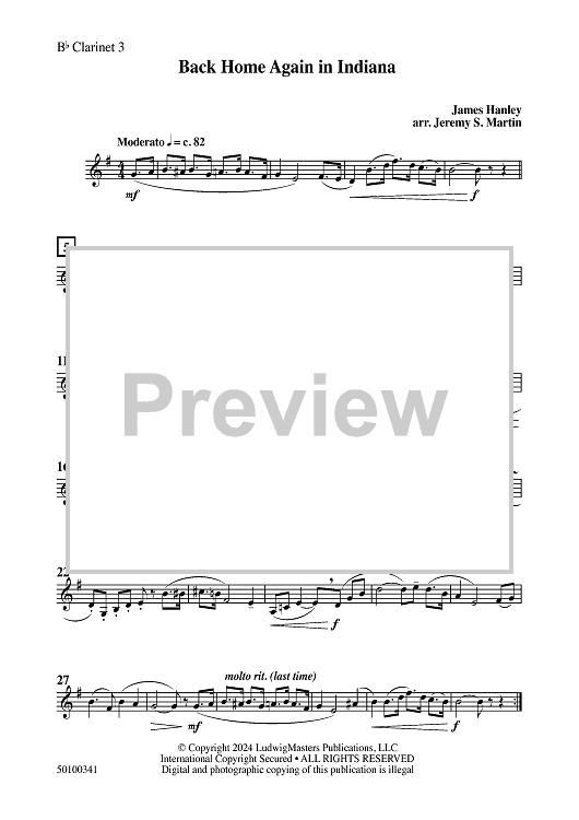 Digital Sheet Music for Back Home Again in Indiana - Bb Clarinet 3 by James F. Hanley, Jeremy S. Martin scored for Concert Band; id:504481