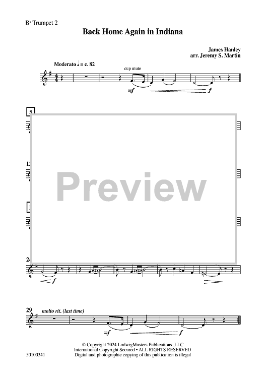 Digital Sheet Music for Back Home Again in Indiana - Bb Trumpet 2 by James F. Hanley, Jeremy S. Martin scored for Concert Band; id:504492