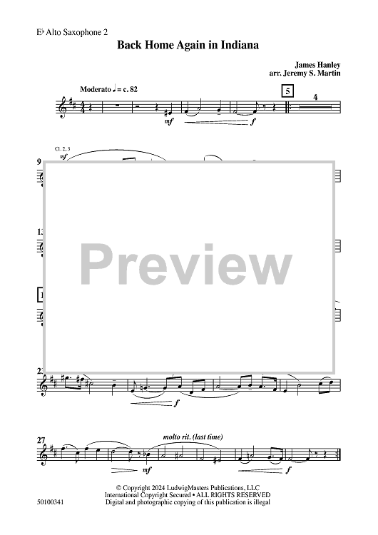 Digital Sheet Music for Back Home Again in Indiana - Eb Alto Sax 2 by James F. Hanley, Jeremy S. Martin scored for Concert Band; id:504488