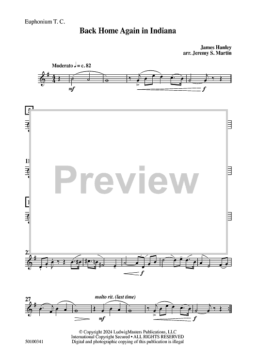 Digital Sheet Music for Back Home Again in Indiana - Euphonium TC by James F. Hanley, Jeremy S. Martin scored for Concert Band; id:504501