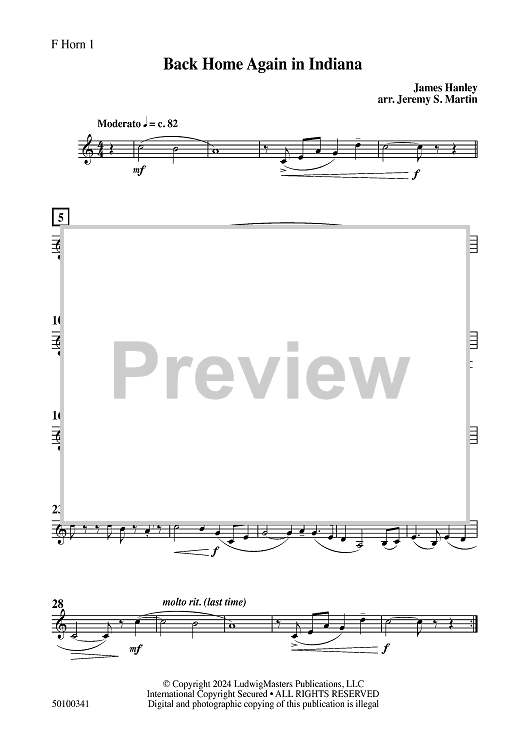 Digital Sheet Music for Back Home Again in Indiana - F Horn 1 by James F. Hanley, Jeremy S. Martin scored for Concert Band; id:504494