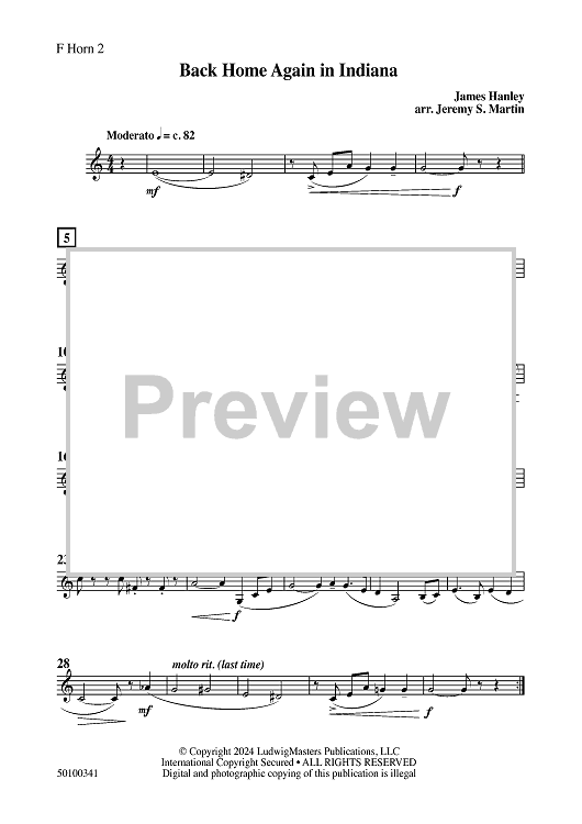 Digital Sheet Music for Back Home Again in Indiana - F Horn 2 by James F. Hanley, Jeremy S. Martin scored for Concert Band; id:504495