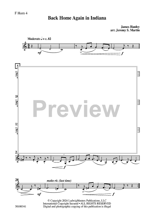 Digital Sheet Music for Back Home Again in Indiana - F Horn 4 by James F. Hanley, Jeremy S. Martin scored for Concert Band; id:504497