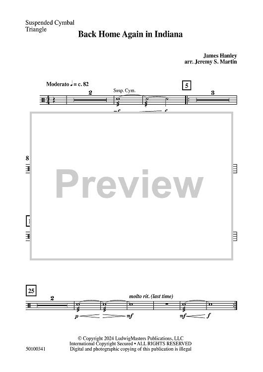 Digital Sheet Music for Back Home Again in Indiana - Suspended Cymbal & Triangle by James F. Hanley, Jeremy S. Martin scored for Concert Band; id:504507