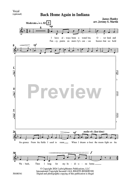 Digital Sheet Music for Back Home Again in Indiana - Vocal (opt.) by James F. Hanley, Jeremy S. Martin scored for Concert Band; id:504508
