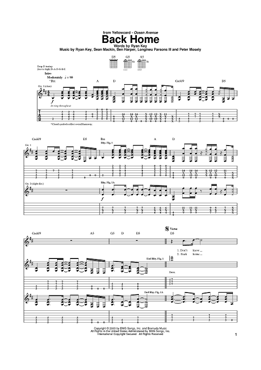 Digital Sheet Music for Back Home by Ben Harper, Ryan Key, Sean Mackin, Peter Mosely, LP, Yellowcard scored for Guitar Tab; id:379223