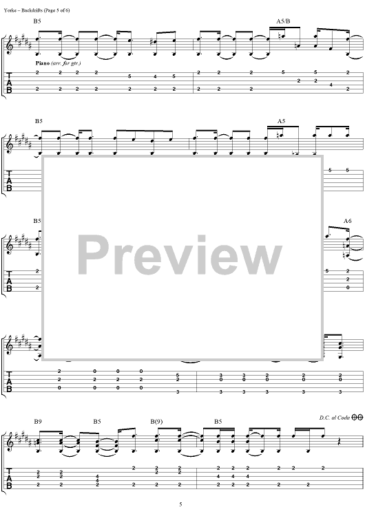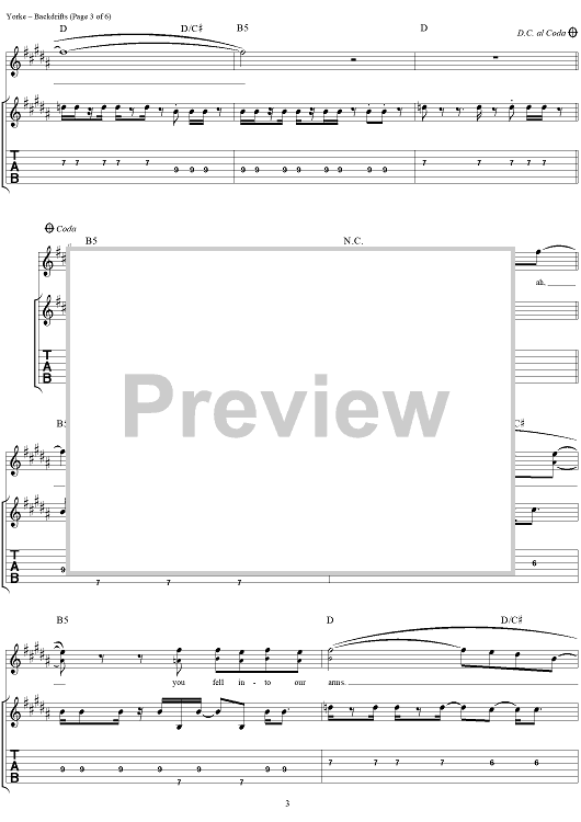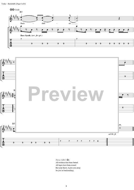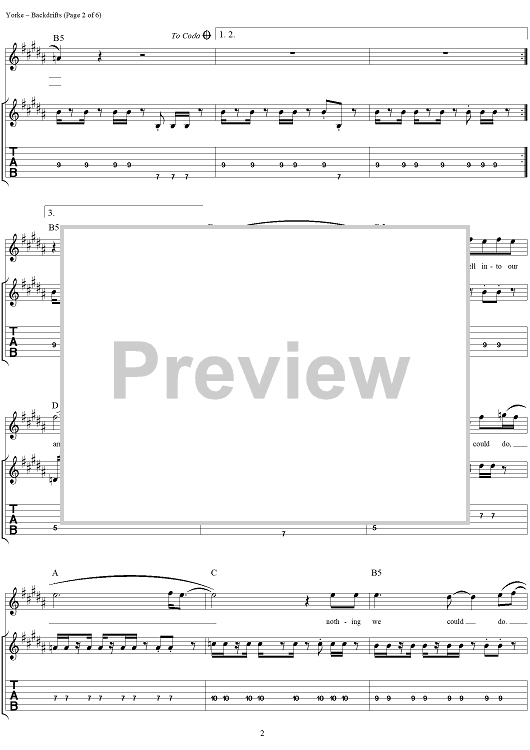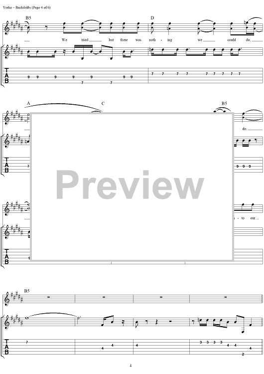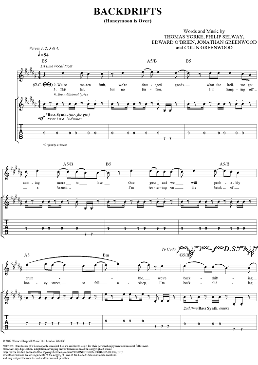 Digital Sheet Music for Backdrifts by Thomas Yorke, Jonathan Greenwood, Philip Selway, Coz, Edward O'Brien, Radiohead scored for Guitar Tab/Vocal; id:297003