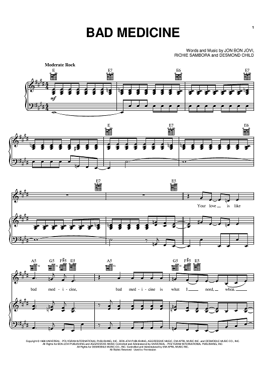 Digital Sheet Music for Bad Medicine by Bon Jovi, Richie Sambora, Desmond Child, Jon Bon Jovi scored for Piano/Vocal/Chords; id:383527