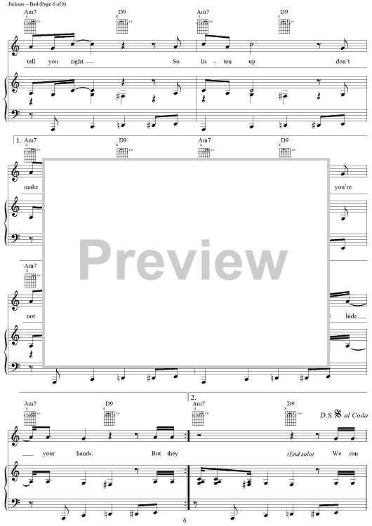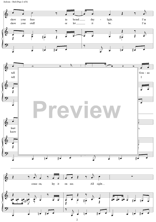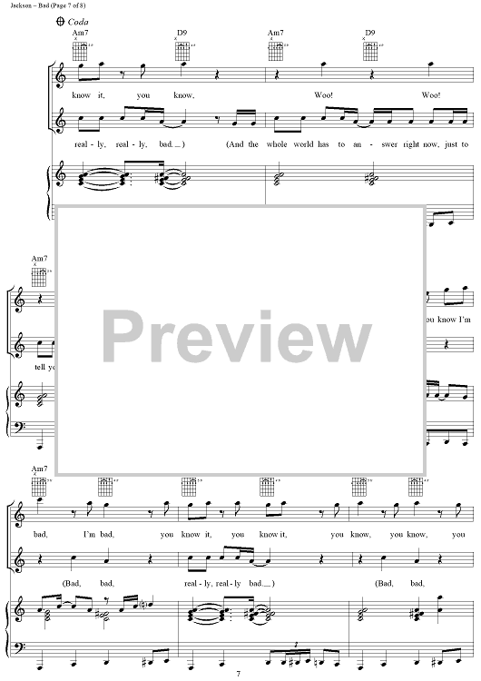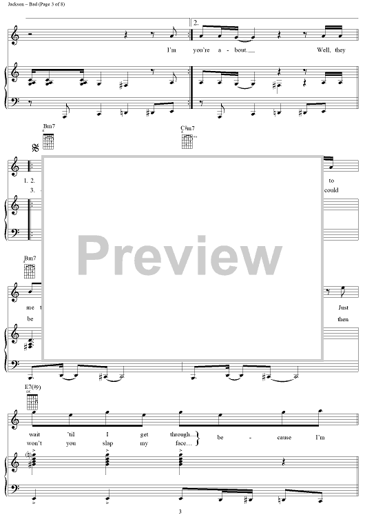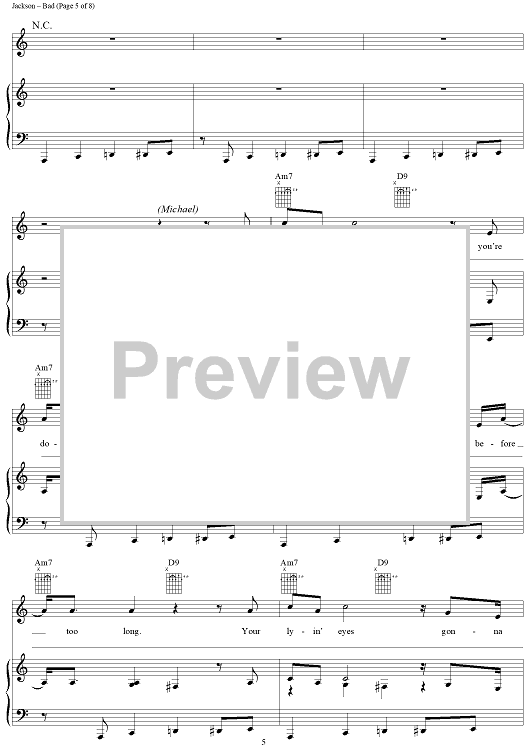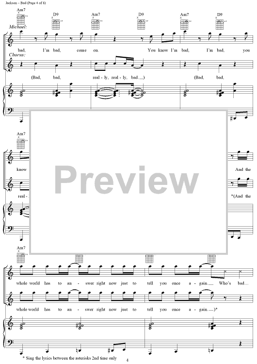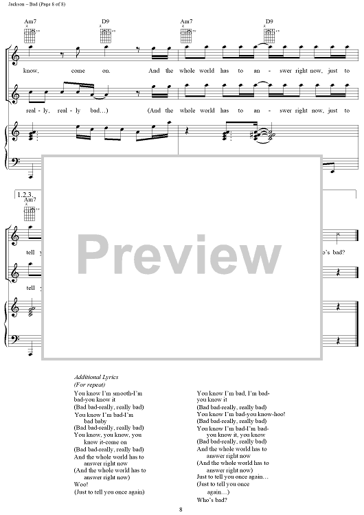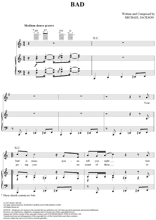 Digital Sheet Music for Bad by Michael Jackson scored for Piano/Vocal/Chords; id:116043