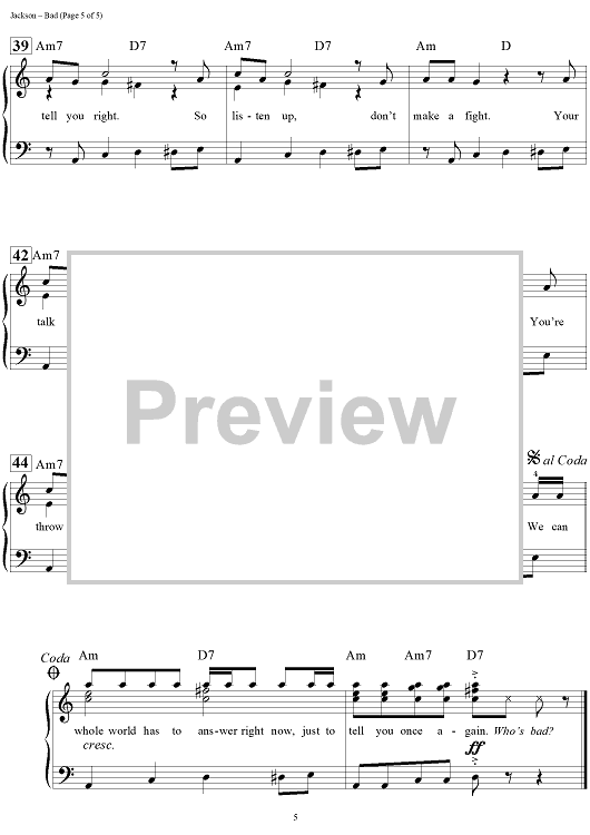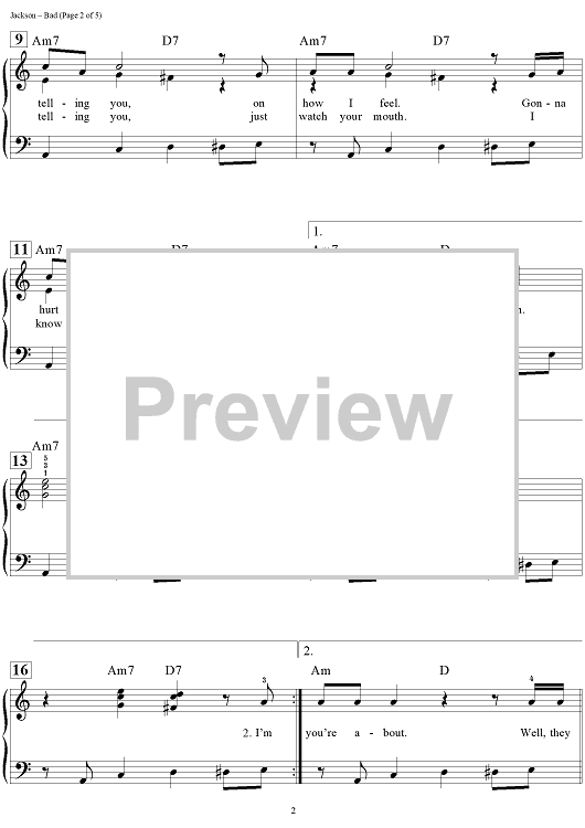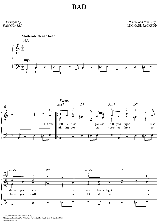 Digital Sheet Music for Bad by Dan Coates, Michael Jackson scored for Easy Piano/Vocal/Chords; id:453472