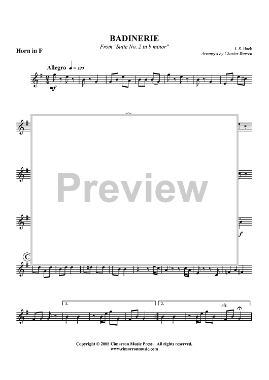 Digital Sheet Music for Badinerie from "Suite #2 in B minor" - Horn in F by Charles Warren, Johann Sebastian Bach scored for Brass Quintet; id:424294