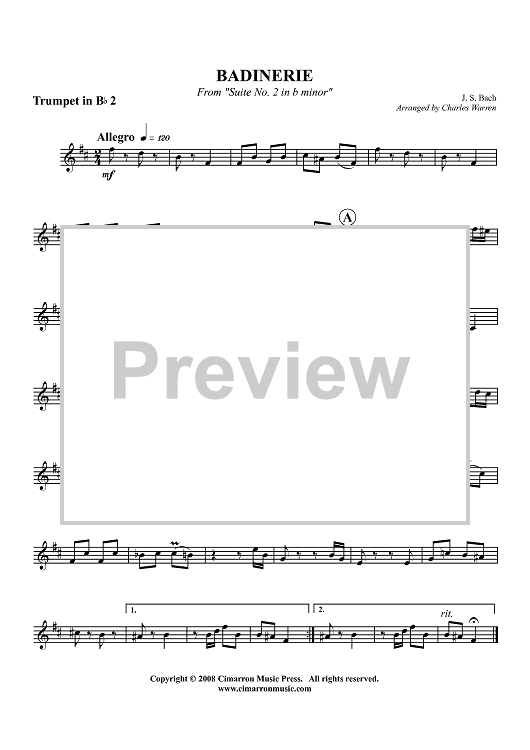Digital Sheet Music for Badinerie from "Suite #2 in B minor" - Trumpet 2 in Bb by Charles Warren, Johann Sebastian Bach scored for Brass Quintet; id:424293