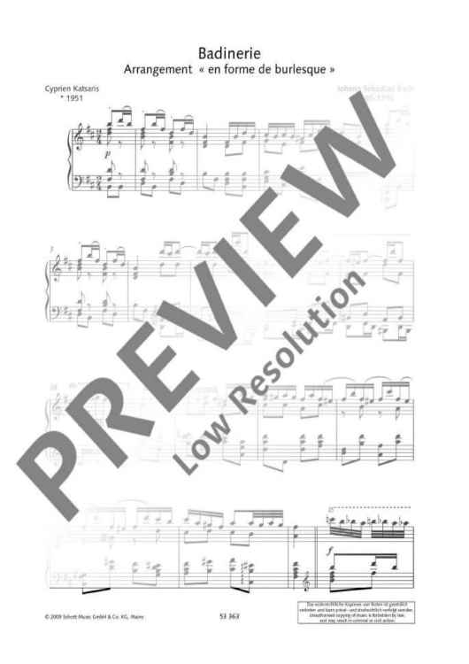 In this series, Schott presents demanding piano transcriptions of well-known works. The series comprises 14 editions, all volumes of which have been compiled with great care and given a special cover. Volume 14 contains a delicate piano paraphrase by the famous pianist Cyprien Katsaris of Johann Sebastian Bach's 'Badinerie', a smash hit in music history. Every eight bars of Bach are followed by the virtuoso 'commentary' of the Paris-based Katsaris. Ambitious pianists are certainly going to enjoy the virtuoso challenge of this effective arrangement.