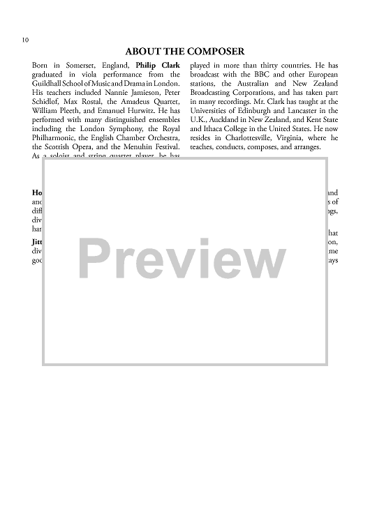 Use your entire pedagogical bag of tricks when teaching these entertaining programmatic pieces. Each title has its own "trick" (rhythmic challenges, bowing styles, chromatic fingerings, harmonics). This collection is perfect for students in that "in between" stage, moving from intermediate to more advanced literature.
