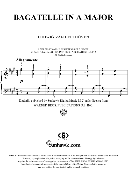 Digital Sheet Music for Bagatelle in A Major by Ludwig van Beethoven, Donald Beattie, Delayna Beattie scored for Easy Piano; id:297647