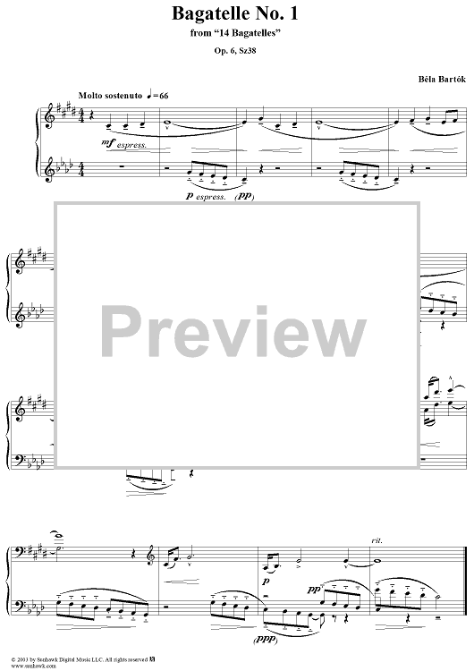 Digital Sheet Music for Bagatelle No. 1 "Molto Sostenuto" by Bela Bartok scored for Piano Solo; id:293700