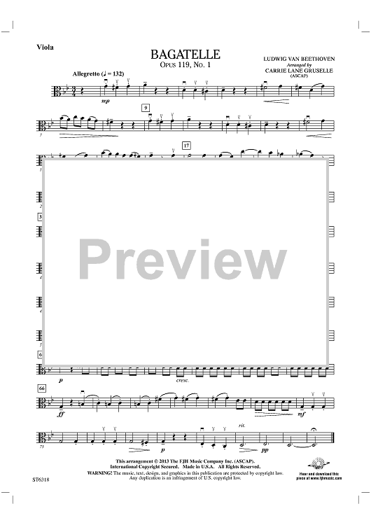 Digital Sheet Music for Bagatelle, Opus 119, No. 1 - Viola by Ludwig van Beethoven, Carrie Lane Gruselle scored for String Orchestra; id:437043