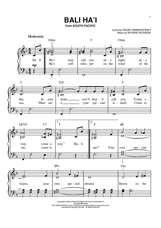 Digital Sheet Music for Bali Ha'i by Richard Rodgers, Oscar Hammerstein II scored for Easy Piano; id:390453