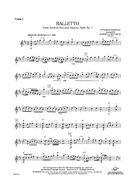 Digital Sheet Music for Balletto from Ancient Airs and Dances, Suite No. 1 - Violin 1 by Ottorino Respighi, Robert D. McCashin scored for String Orchestra; id:437025
