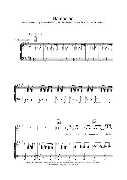 Digital Sheet Music for Bamboleo by Tonino Baliardo, Jalhoul Bouchikhi, Simon Diaz, Gipsy Kings, Nicolas Reyes scored for Piano/Vocal/Chords; id:395656