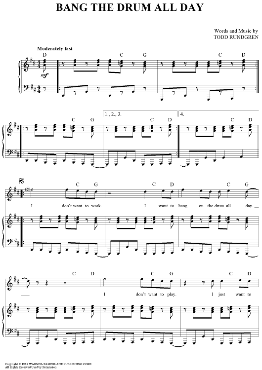 "Bang The Drum All Day" Sheet Music by Todd Rundgren