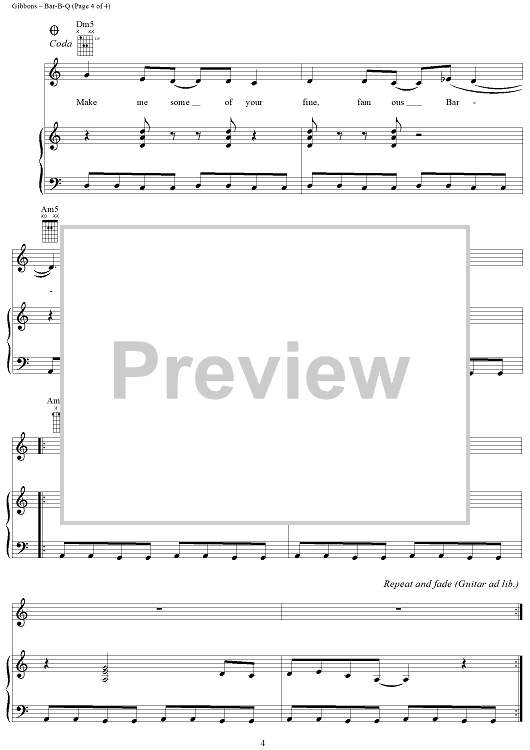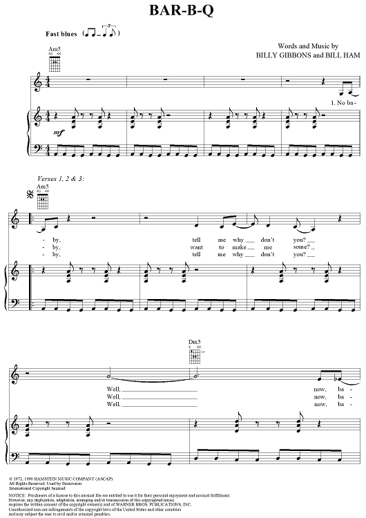 Digital Sheet Music for Bar-B-Q by Billy Gibbons, Bill Ham, ZZ Top scored for Piano/Vocal/Chords; id:202263