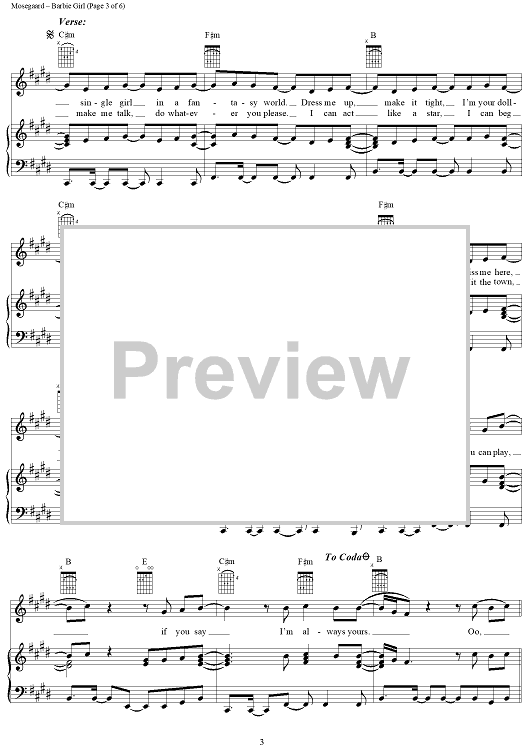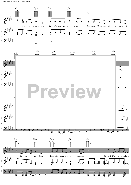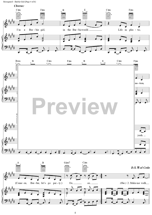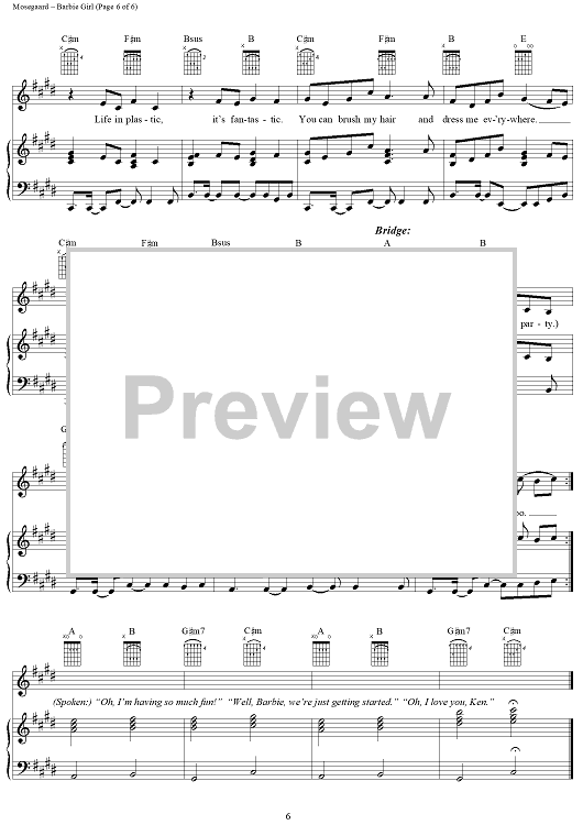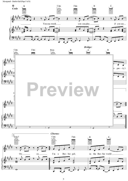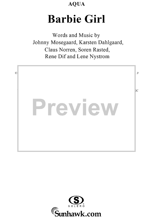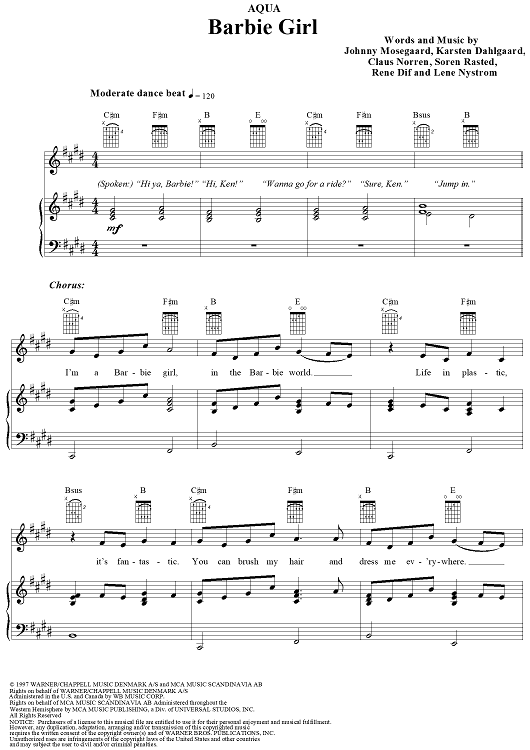 Digital Sheet Music for Barbie Girl by Johnny Mosegaard, Karsten Dahlgaard, Claus Norren, Soren Rasted, Lene Nystrom, Aqua, René Dif scored for Piano/Vocal/Chords; id:112185