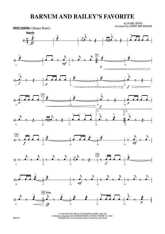 Digital Sheet Music for Barnum And Bailey's Favorite - Percussion 1 by Jerry Brubaker, Karl King scored for Concert Band; id:403889