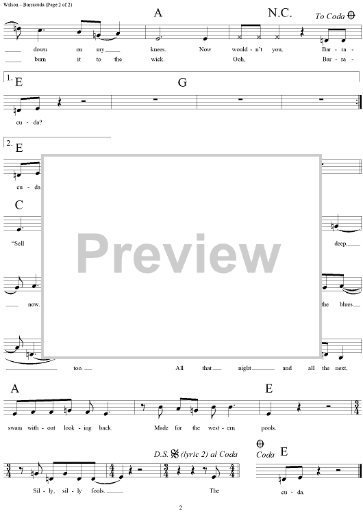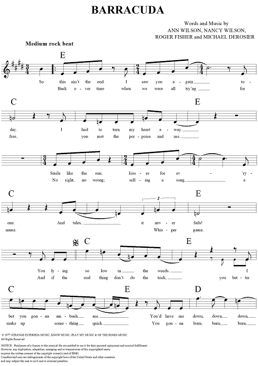 Digital Sheet Music for Barracuda by Heart, Ann Wilson, Nancy Wilson, Michael Derosier, Roger Fisher scored for Lead Sheet; id:263911