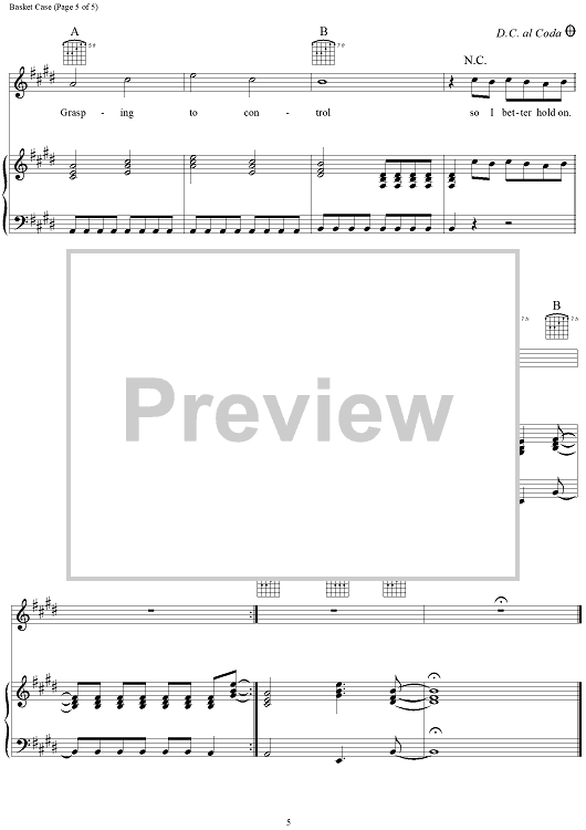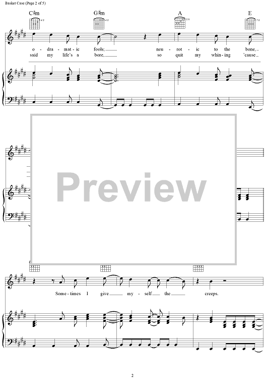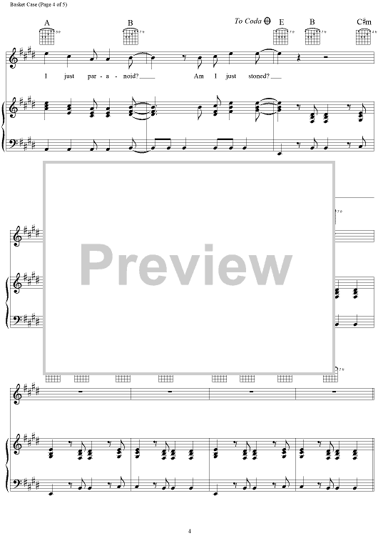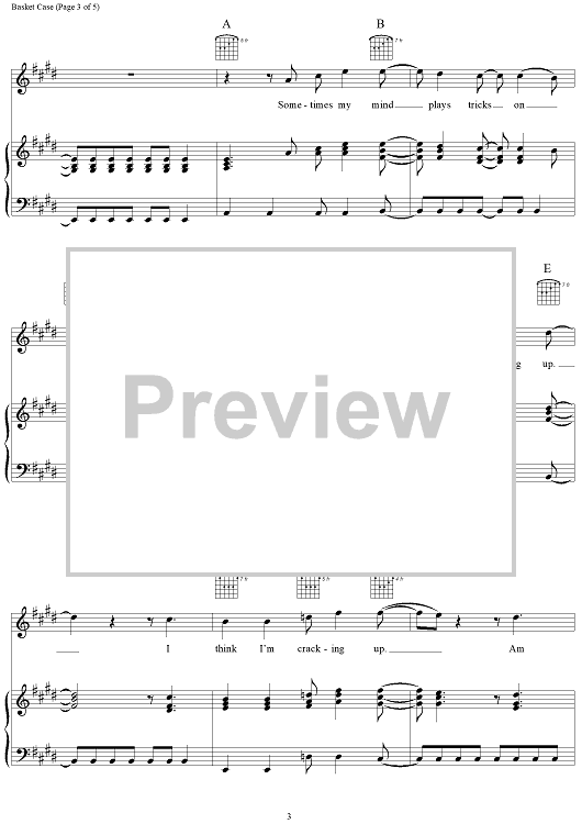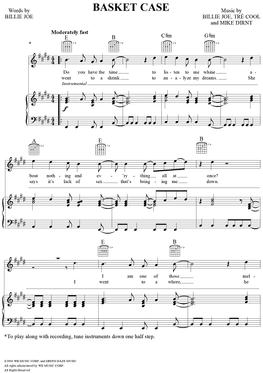 Digital Sheet Music for Basket Case by Billie Joe Armstrong, Tré Cool, Mike Dirnt, Green Day scored for Piano/Vocal/Chords; id:109253