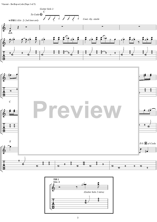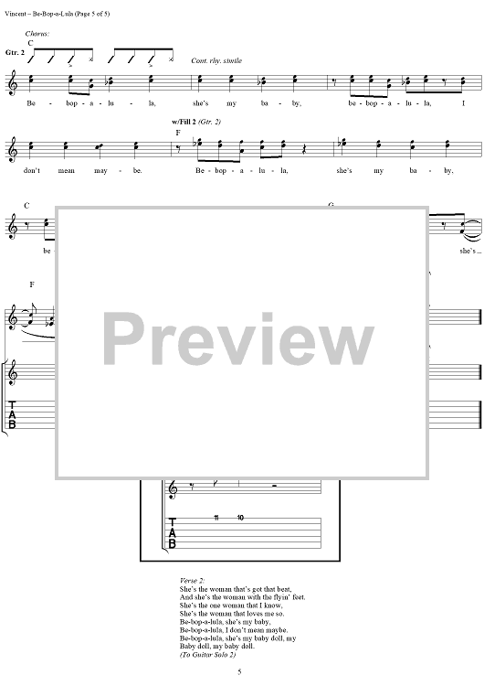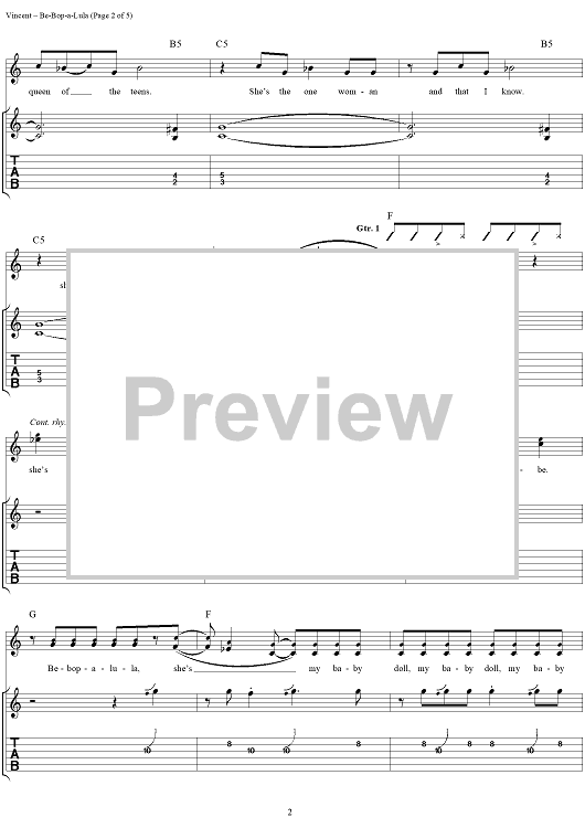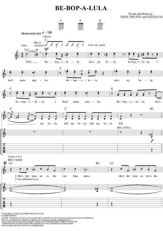 Digital Sheet Music for Be-Bop-a-Lula by Gene Vincent, Tex Davis, The Everly Brothers scored for Guitar Tab/Vocal; id:119226
