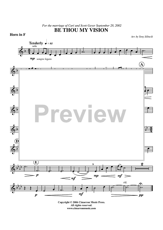 Digital Sheet Music for Be Thou My Vision - Horn in F by , Tony Zilincik scored for Brass Quintet; id:357490