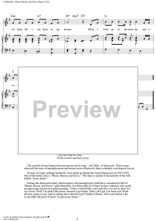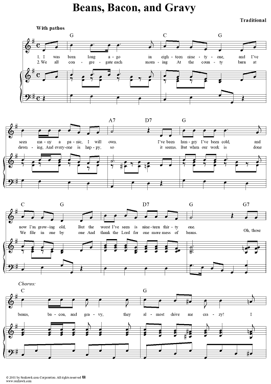 Digital Sheet Music for Beans, Bacon, and Gravy by Traditional scored for Piano/Vocal/Chords; id:260433