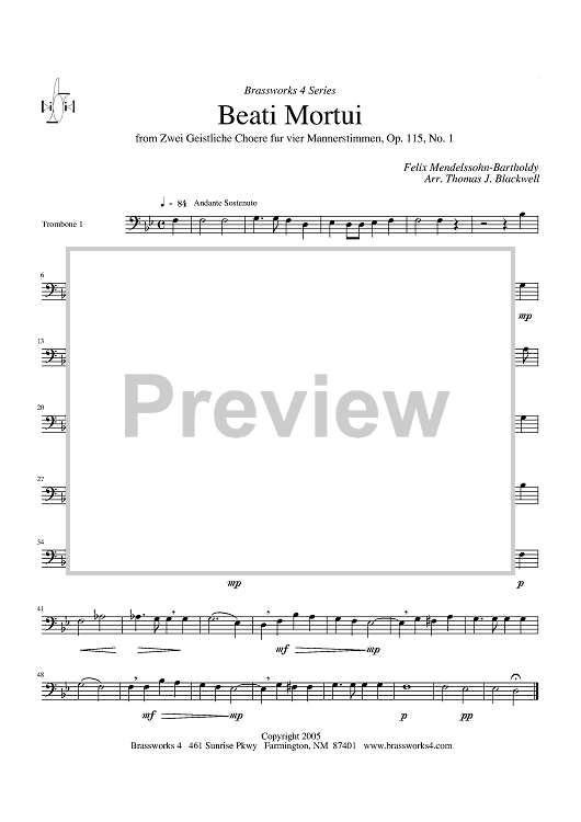 Digital Sheet Music for Beati Mortui - Trombone 1 by Felix Mendelssohn, Thomas J. Blackwell scored for Brass Quartet; id:318793