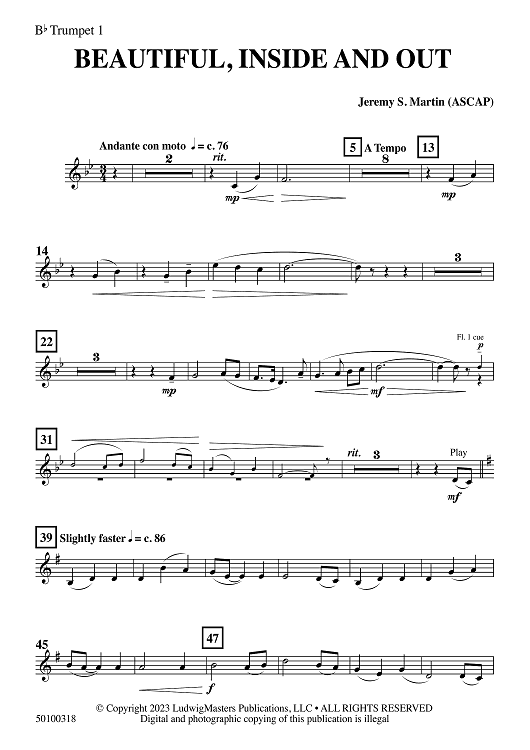 Digital Sheet Music for Beautiful Inside and Out - Bb Trumpet 1 by Jeremy S. Martin scored for Concert Band; id:509754