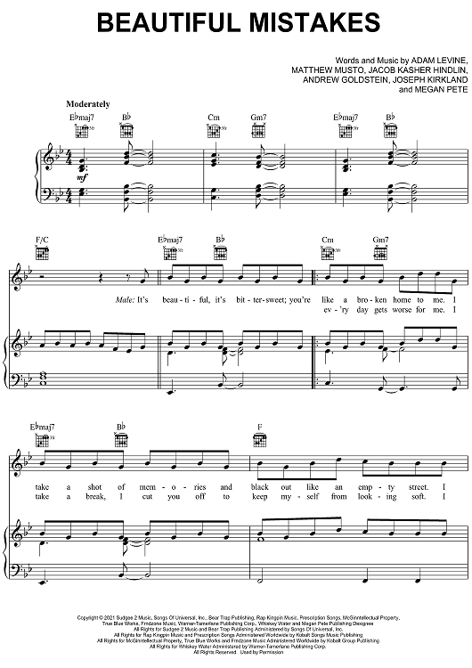 Digital Sheet Music for Beautiful Mistakes by Adam Levine, Maroon 5, Jacob Hindlin, Matt Musto, Andrew Goldstein, Joseph Kirkland, Megan Pete scored for Piano/Vocal/Chords; id:469079
