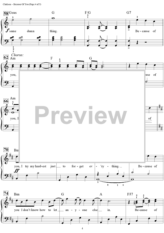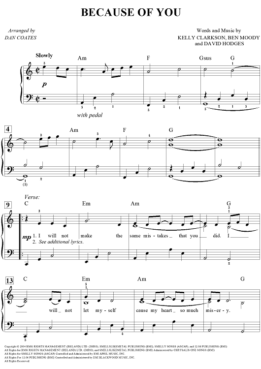 Digital Sheet Music for Because of You by Dan Coates, Reba McEntire, Ben Moody, David Hodges, Kelly Clarkson scored for Easy Piano/Vocal/Chords; id:444019