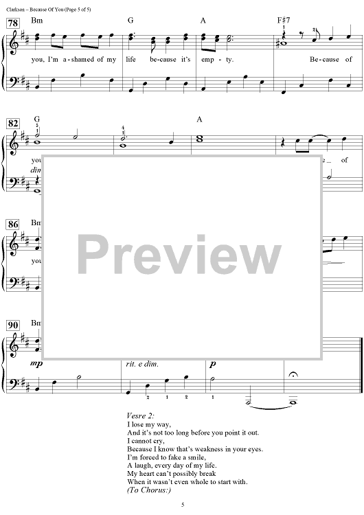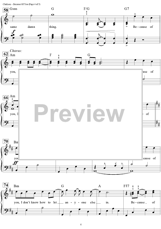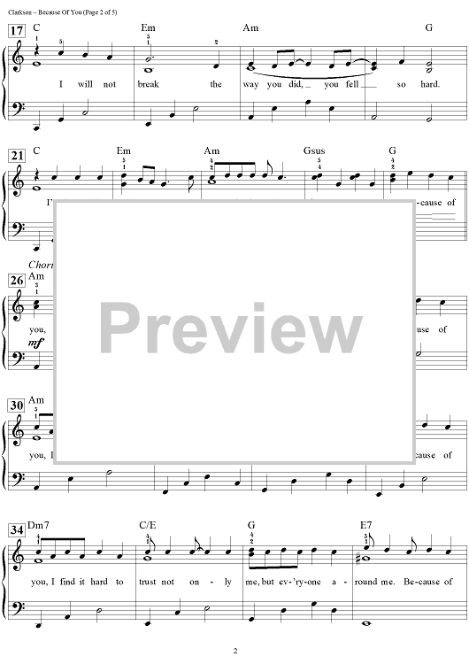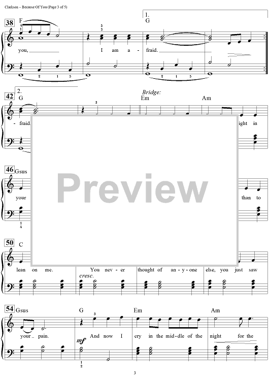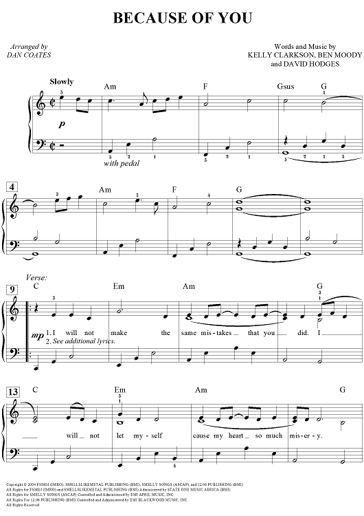 Digital Sheet Music for Because of You by Dan Coates, Ben Moody, David Hodges, Kelly Clarkson scored for Easy Piano/Vocal/Chords; id:457277