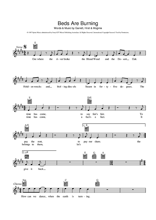 "Beds Are Burning" Sheet Music by Midnight Oil