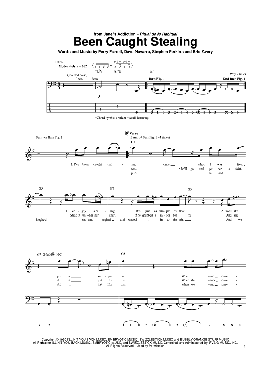 Digital Sheet Music for Been Caught Stealing by Eric Avery, Perry Farrell, Jane's Addiction, Dave Navarro, Stephen Perkins scored for Bass Tab; id:382321