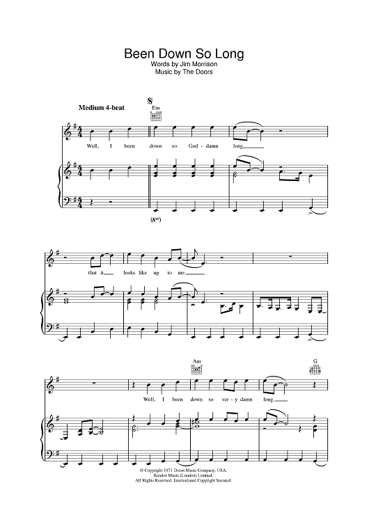 Digital Sheet Music for Been Down So Long by The Doors, Jim Morrison scored for Piano/Vocal/Chords; id:390621