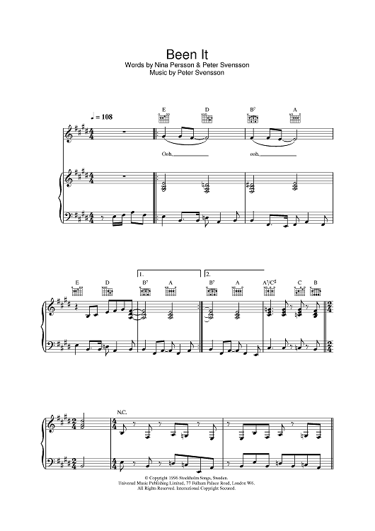 Digital Sheet Music for Been It by Nina Persson, Peter Svensson, The Cardigans scored for Piano/Vocal/Chords; id:390618