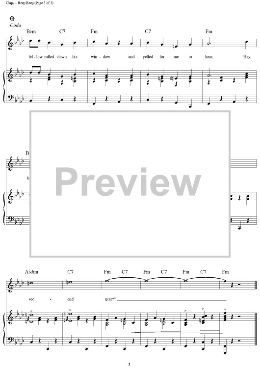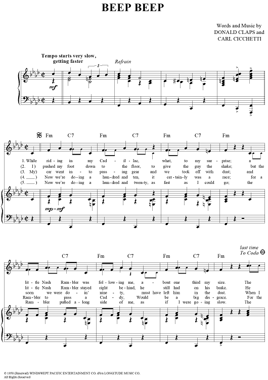 Digital Sheet Music for Beep Beep by Donald Claps, Carl Cicchetti, The Playmates scored for Piano/Vocal/Chords; id:129474